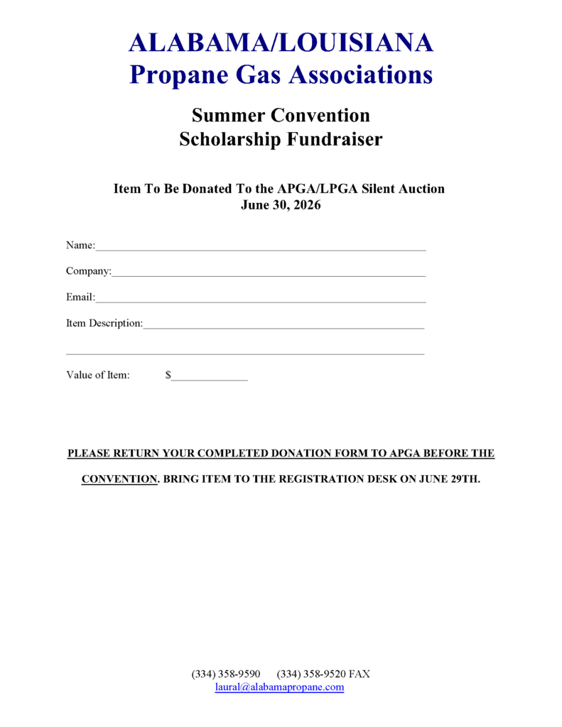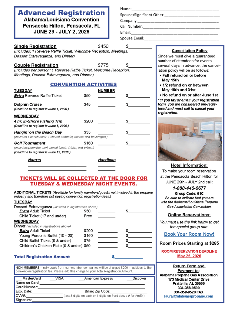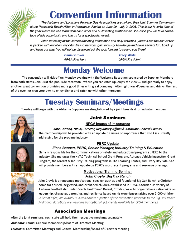 Please download the brochure at the link below for all information regarding schedules, tickets, extra activities, and hotel reservations. If you have any questions, don’t hesitate to contact Laural Bunn (laural@alabamapropane.com) at the APGA Office.