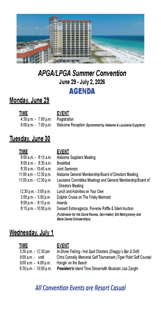 Registration for the 2026 APGA/LPGA Summer Convention is officially open! This year, we will be headed to the Hilton Hotel in Pensacola Beach, FL from June 29-July 2, 2026.